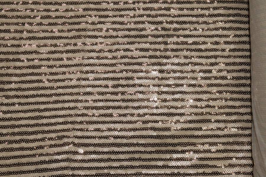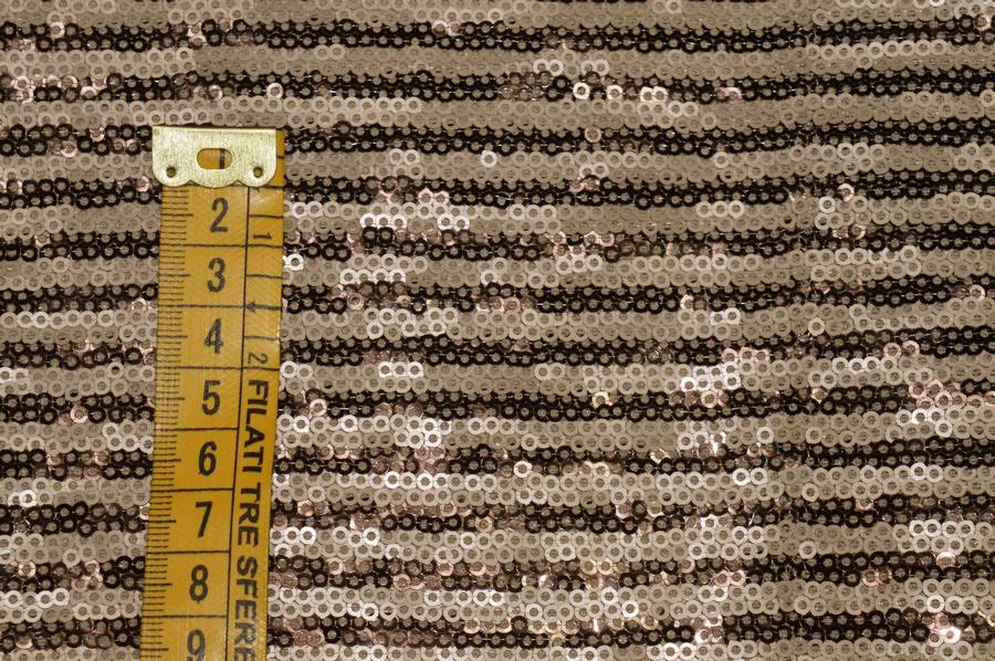 Tessuto fondo tulle elasticizzato beige con paillettes cucite beige e marrone scuro di diametro 3 millimetri circa a formare un disegno riga. Idonea per realizzare top, abiti eleganti ed inserti