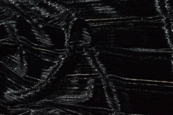 Tessuto in ciniglia rigato effetto Devorè con fili Lurex argento che donano al tessuto un aspetto elegante. Leggero e morbido è idoneo per realizzare abitini e casacche