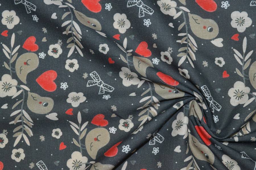 Tessuto puro cotone di pesantezza medio/leggera(tipo lenzuolo), idoneo per realizzare abbigliamento vario,piccoli lavori di tappezzeria e cucito creativo.Fondo grigio scuro