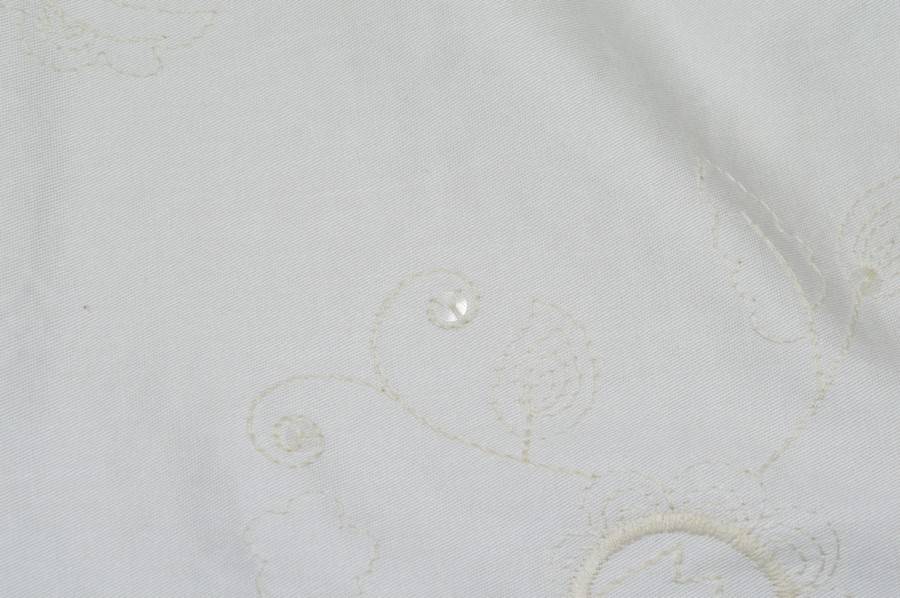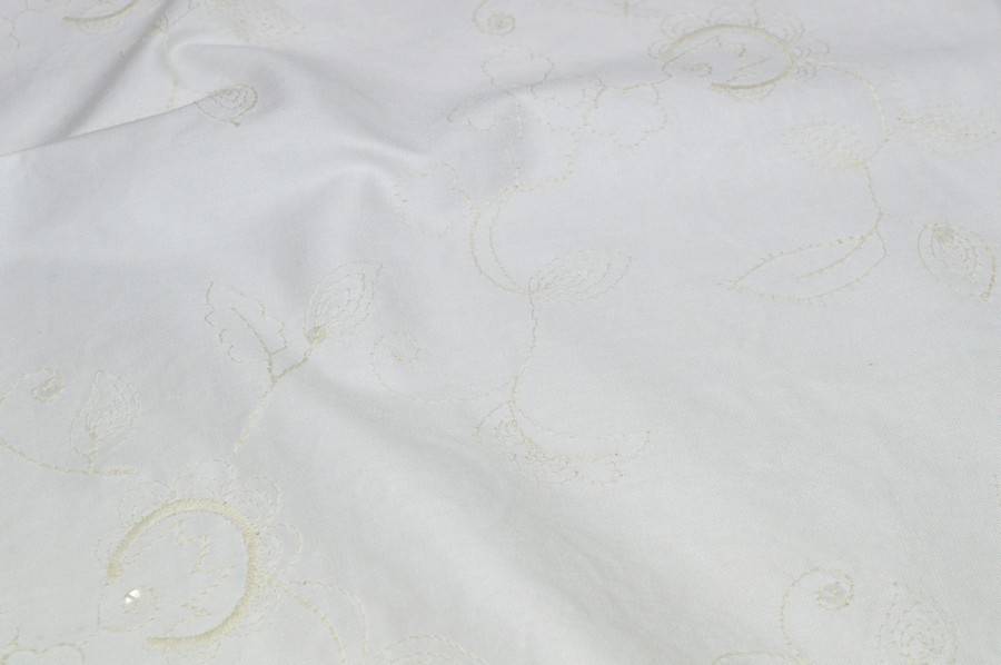 Tessuto fondo cotone leggermente elasticizzato ,ricamato con filo ecrù a campo pieno,presenta inserti di piccole paillettes trasparenti che donano un leggero punto luce.