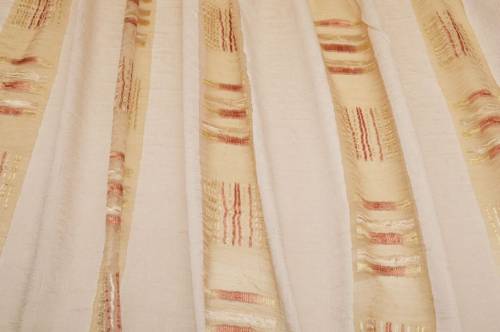 Tessuto coprente ma filtrante alla luce, struttura sostenuta e rigida, aspetto luminoso . Idoneo per realizzare tende arricciate