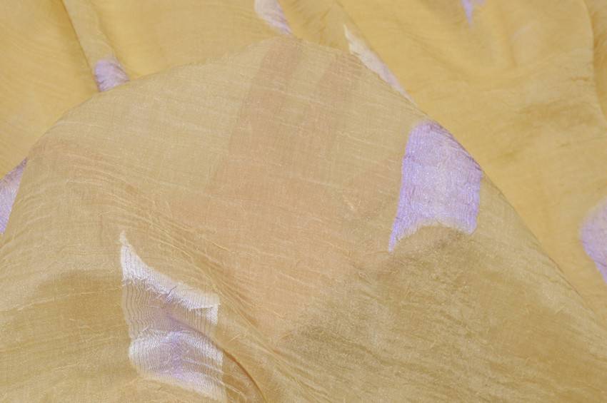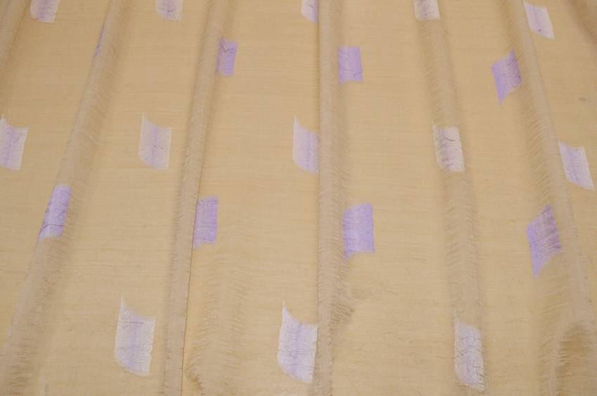 Tessuto dal fondo beige/oro dal finish trasparente e leggero. Appare stropicciato con ricami geometrici fil loupe lilla, ideale per realizzare qualsiasi tipologia di tenda.