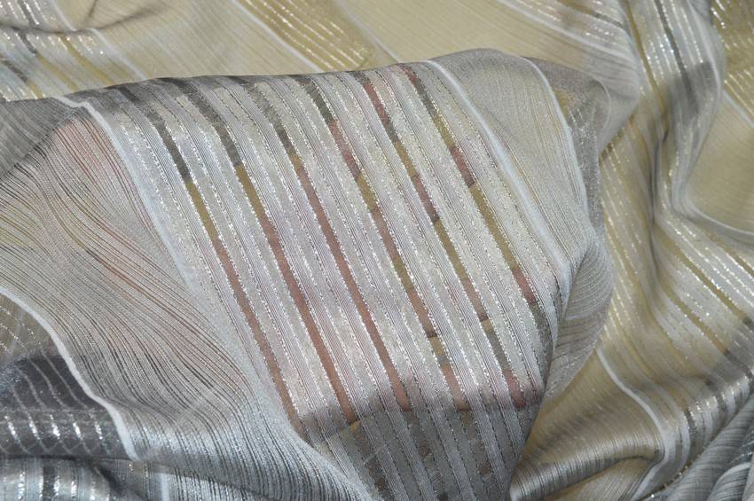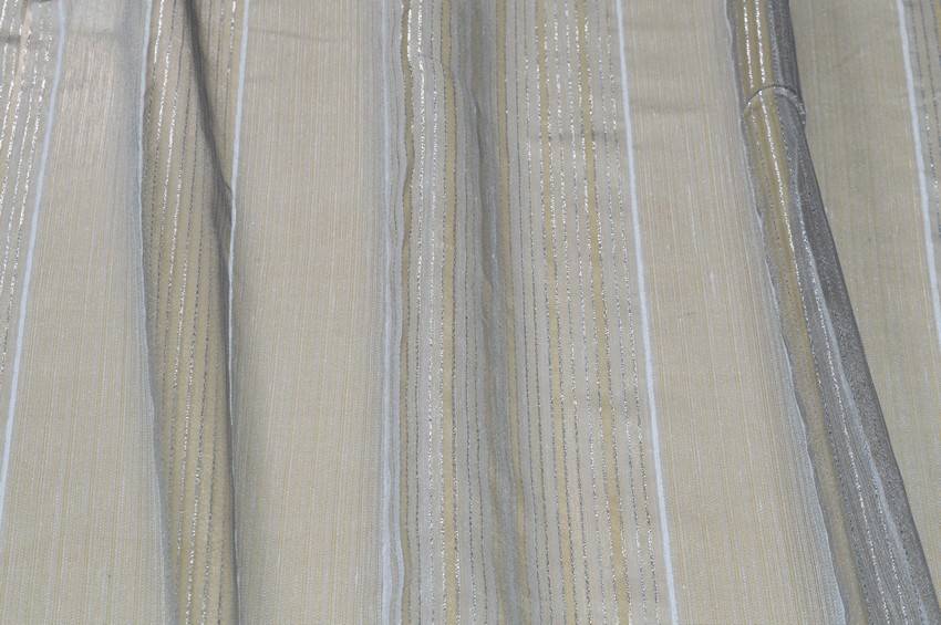 Tessuto dal fondo in organza dal finish trasparente e leggero. Presenta una trama decorata con fili lurex argento. Ottimale per realizzare tende arricciate.