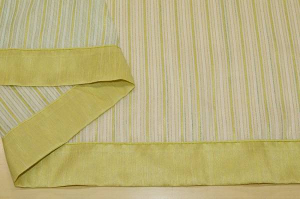 Tessuto tenda semi trasparente con bordo verde sui lati. Da orlare solo sopra e sotto. Idoneo per realizzare tendine a vetro.