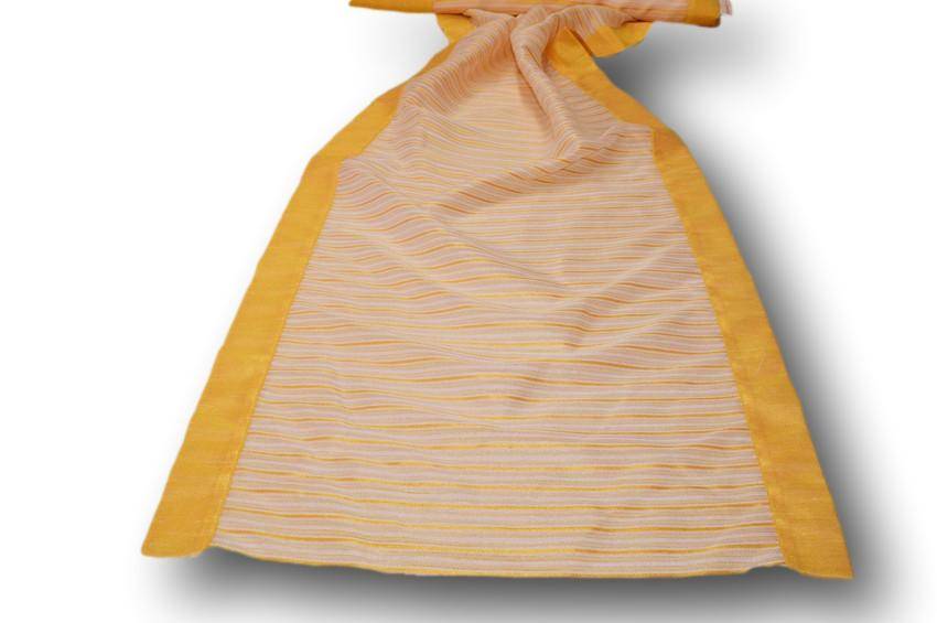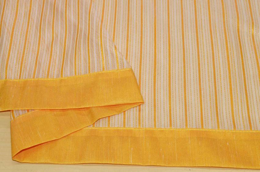 Tessuto tenda semi trasparente con bordo giallo sui lati. Da orlare solo sopra e sotto. Idoneo per realizzare tendine a vetro.
