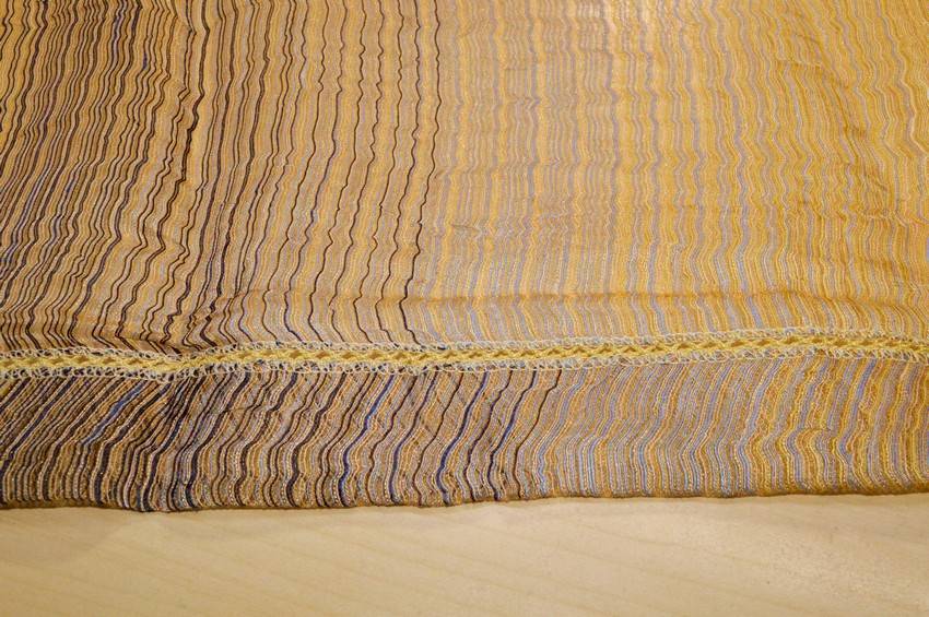Originale tessuto tenda semitrasparente che dona luminosità alla stanza poiché filtrante alla luce. Presenta una fantasia con sfumature dall'oro al blu. Già orlato nei laterali. Perfetto per realizzare particolari tendine a vetro.