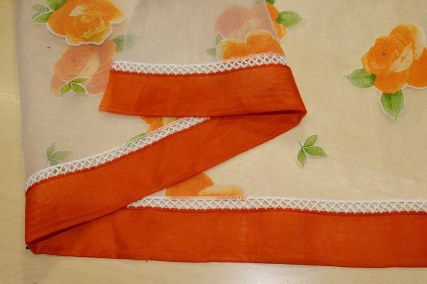 Tessuto semi-trasparente con vivace stampa floreale arancio. Lateramente già bordato con fasce arancioni che riprendono la fantasia. Ideale per realizzare tendini a vetro.