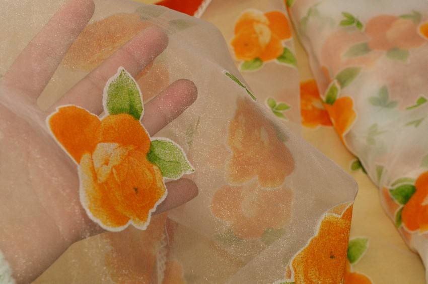 TESSUTO TENDA VETRO VELO STAMPATO FIORE ARANCIO