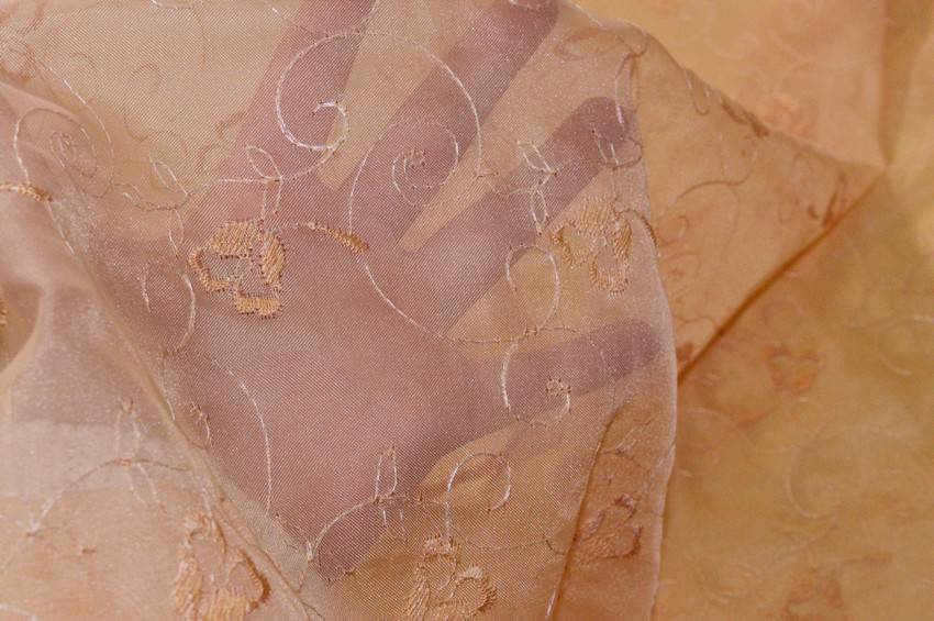 Tessuto tenda semitrasparente dal fondo salmone. La stoffa viene abbellita dal ricamo floreale con dettagli bianchi che donano lucentezza e delicatezza. Perfetto per realizzare classici tendini a vetro.