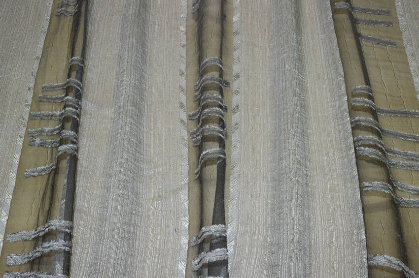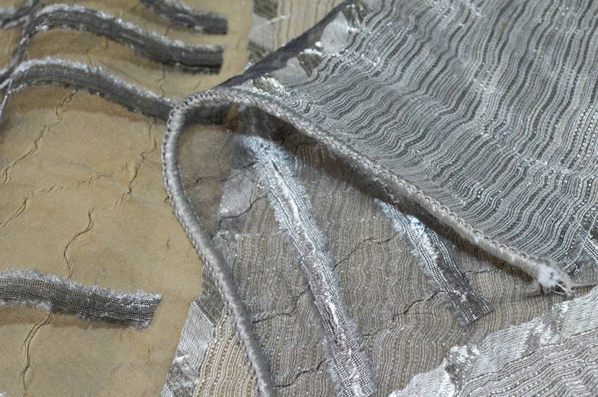 Luminoso tessuto per tende in organza stropicciata di fondo grigio. La stoffa viene decorata da intarsi geometrici argentati che donano eleganza e unicità. Perfetto per realizzare tutte le tipologie di tende arricciate.