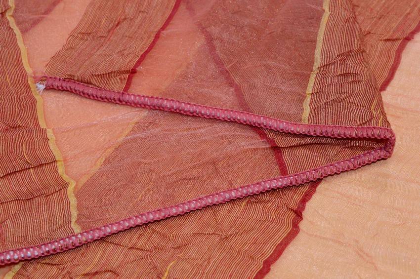 Tessuto per tende in organza semi-trasparente e filtrante alla luce donando alla stanza luminosità. Il fondo viene vivacizzato dalle bande color salmone, impreziosite da sottili striature gialle e rosse. Ideale per realizzare allegre tende arricciate.