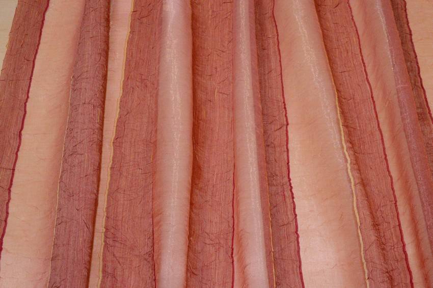 Tessuto per tende in organza semi-trasparente e filtrante alla luce donando alla stanza luminosità. Il fondo viene vivacizzato dalle bande color salmone, impreziosite da sottili striature gialle e rosse. Ideale per realizzare allegre tende arricciate.