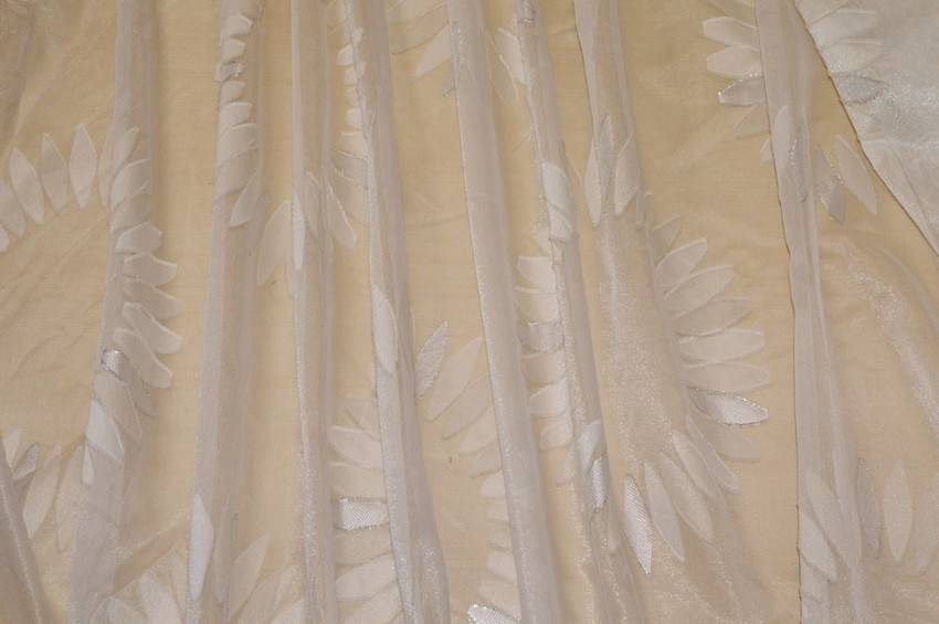 Tessuto per tende in organza filtrante alla luce e di struttura sostenuta. L'elegante fondo chiaro viene decorato da intarsi atti a ricreare dei petali color bianco, avorio e argento. I fiori hanno un diametro di cm 39. Prezioso e delicato è perfetto per realizzare ogni tipo di tende arricciate.