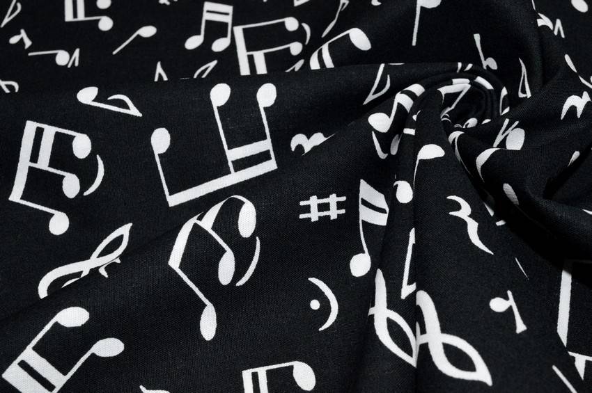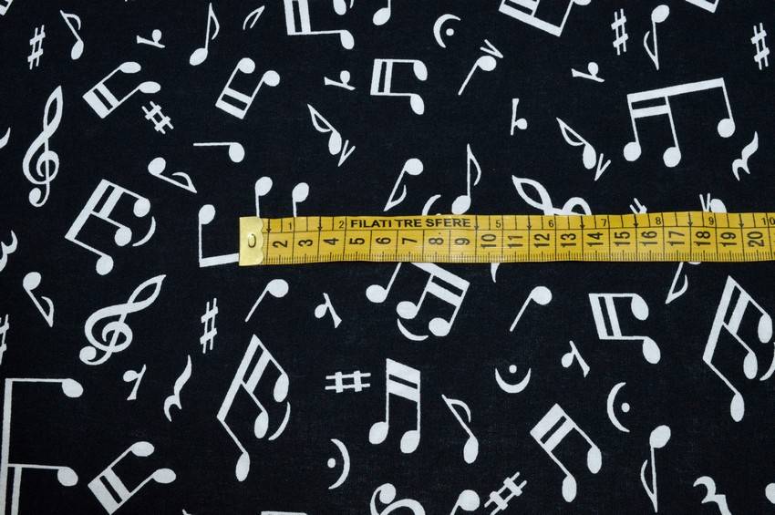 Tessuto in puro cotone di ottima qualità dalla mano morbida e confortevole. Il fondo nero viene decorato da piccole note musicali bianche di diverse forme. Simpatica e giocosa è la stoffa perfetta per creare piccoli lavori di arredo camerette come copricuscini e lenzuolini.