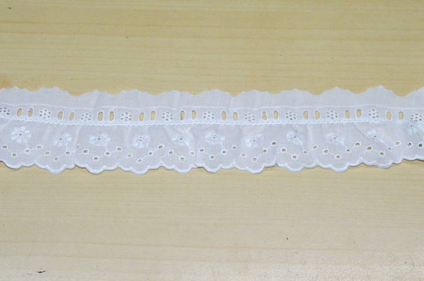 Pizzo san gallo arricciato in puro cotone bianco di altezza cm 6. Ideale per applicazioni su lenzuolini, capi d'abbigliamento e lavori di cucito creativo vario.