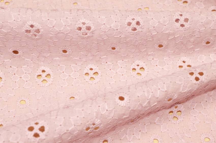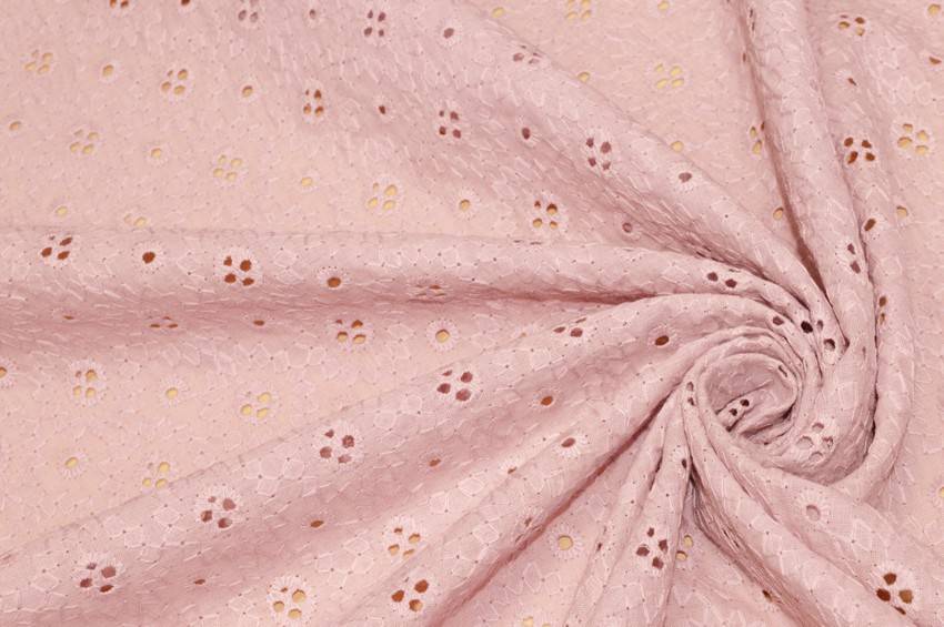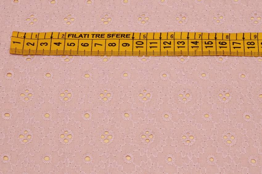 Tessuto in puro cotone di mano leggera e morbida. Il fondo color rosa antico/cipria ( non rosa baby) viene decorato dal fine ricamo di 3 cm. Idoneo per camiceria e per arredamento culle.