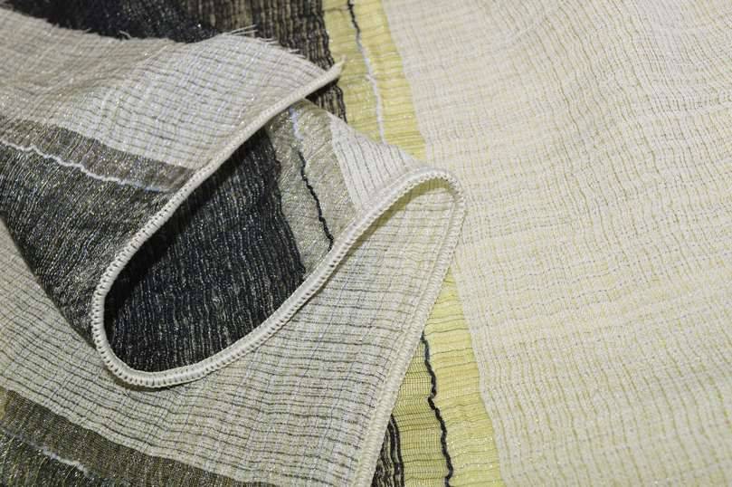 Tessuto idoneo per tendaggi di mano leggera e cadente unita ad un aspetto luminoso e filtrante alla luce, ottimale per arredare l'ambiente senza rinunciare all'illuminazione della stanza. Il fondo presenta una fantasia rigata composta fa irregolari fasce nere e color sabbia/beige chiaro (non bianco, non panna). Perfetto per la confezione di tende arricciate.
