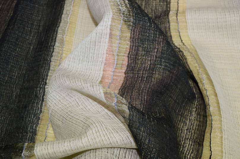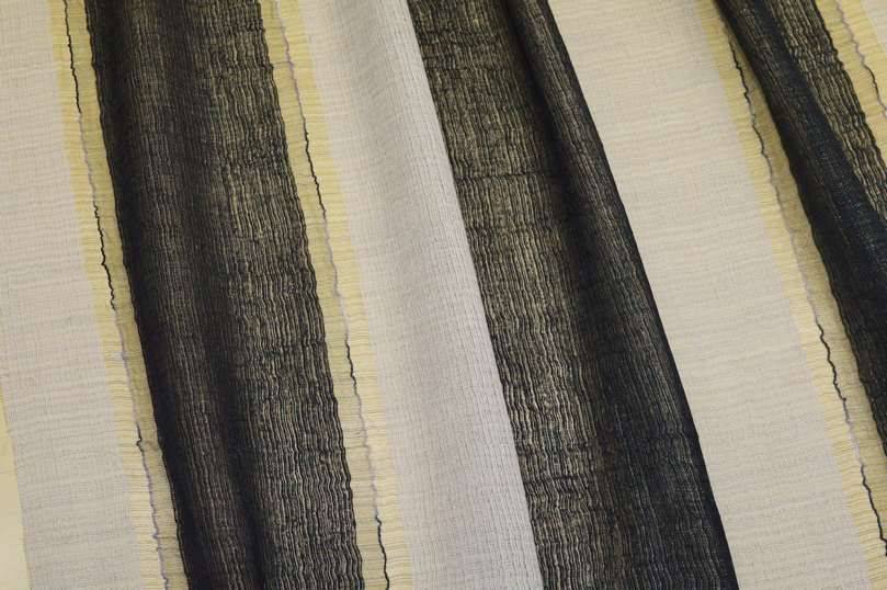 Tessuto idoneo per tendaggi di mano leggera e cadente unita ad un aspetto luminoso e filtrante alla luce, ottimale per arredare l'ambiente senza rinunciare all'illuminazione della stanza. Il fondo presenta una fantasia rigata composta fa irregolari fasce nere e color sabbia/beige chiaro (non bianco, non panna). Perfetto per la confezione di tende arricciate.