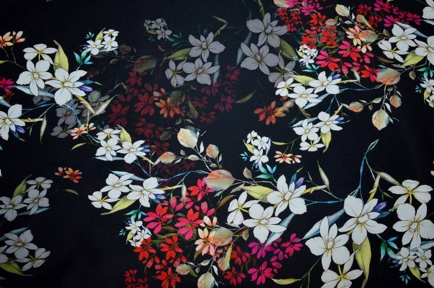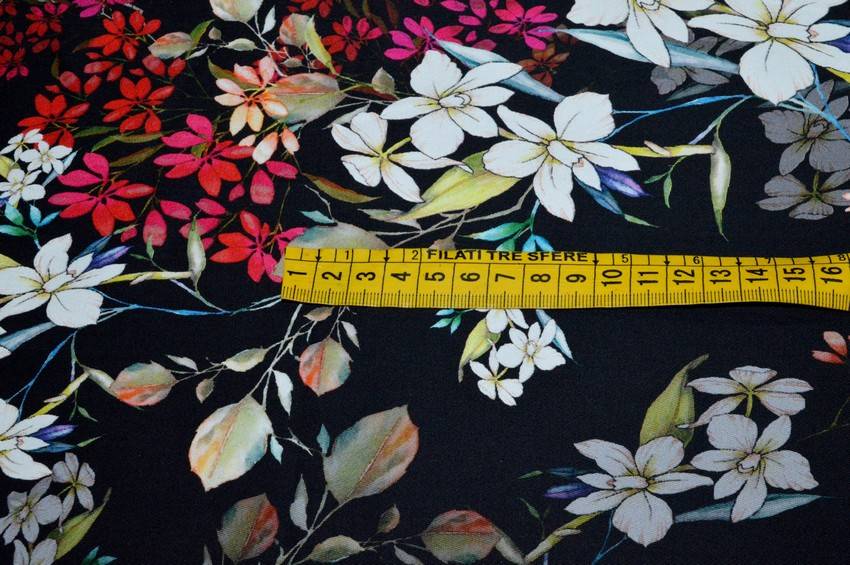 Tessuto gabardine in puro cotone elasticizzato di peso medio. Presenta una splendida fantasia floreale a contrasto con il fondo nero. Idoneo per realizzare pantaloni estivi, gonne, giacche ed abitini.