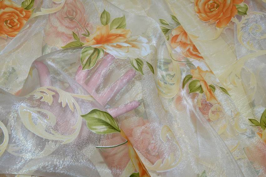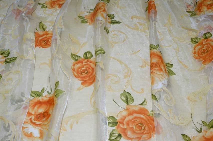 Tessuto per tende in organza con fondo molto leggero e trasparente. La stoffa viene abbellita dalla stampa floreale arancione con sottili linee dorate che donano luminosità. Idoneo per realizzare tende arricciate di ogni tipo.