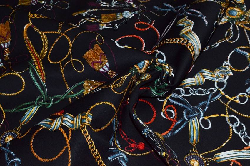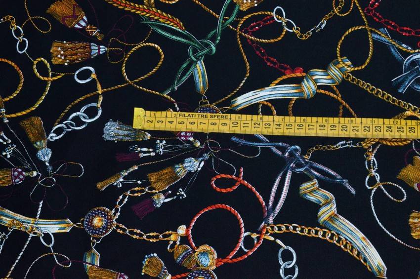 Tessuto gabardine in cotone elasticizzato con una splendida fantasia a contrasto con il fondo nero. Di medio peso è ottimale per realizzare personalizzati ed unici pantaloni estivi, gonne, giacchettine ed abiti.