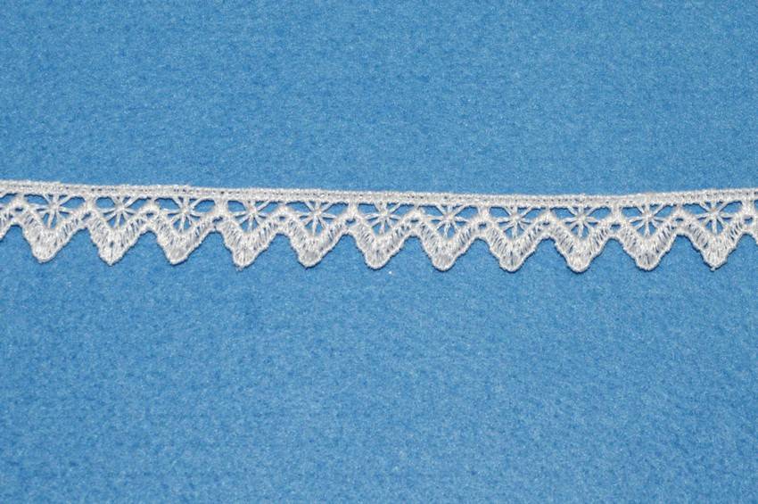 Pizzo bianco alto 1.5 cm. Ottimo per abbellire i propri lavori di cucito creativo e per arricchire articoli di biancheria per la casa come strofinacci, asciugamani e lenzuola. Utilizzato anche per per rifinire capi d'abbigliamento.