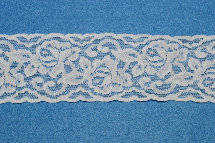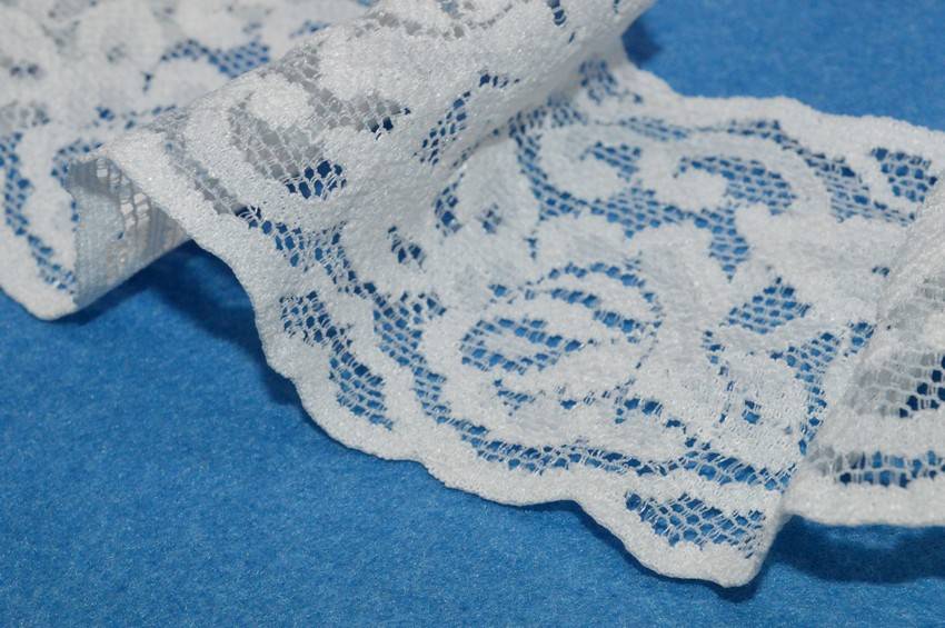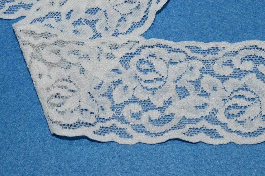 Pizzo bianco elasticizzato alto 6 cm. Ottimo per rifinire capi d'abbigliamento.