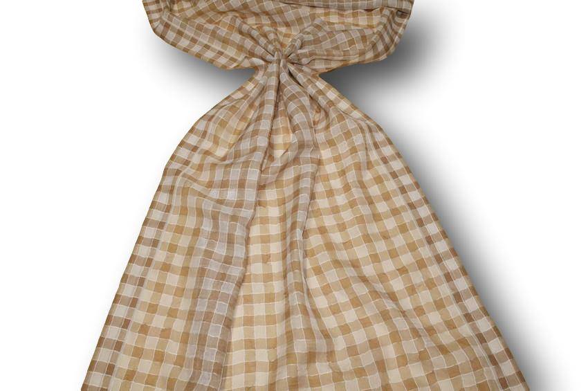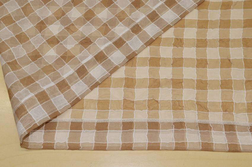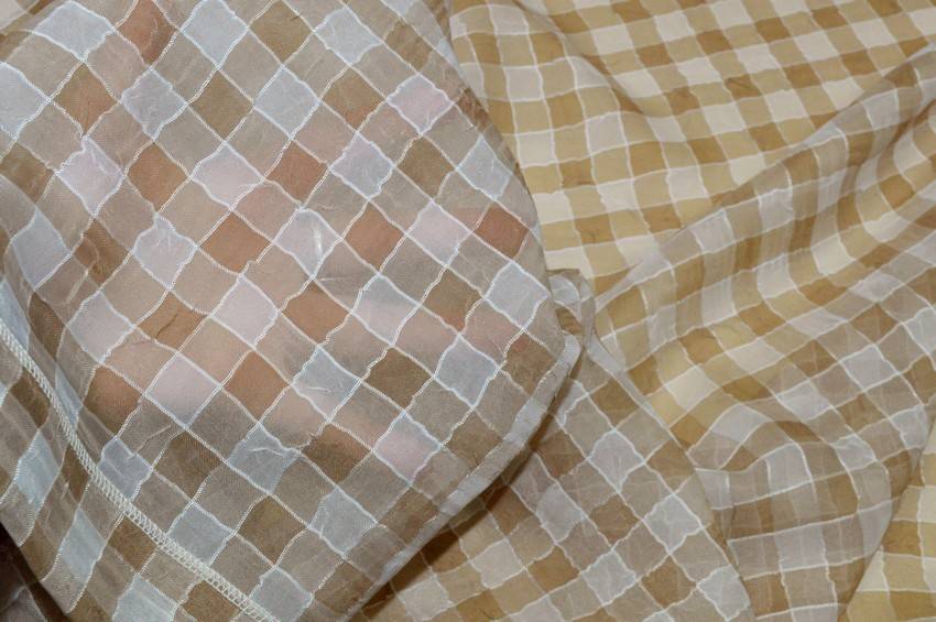 Tessuto con micro-scacco bianco e beige di 1.5x1.5 cm gia orlato lateralmente. Inoltre si presenta leggero, cadente e semitrasparente, ottimo per abbellire la propria casa confezionando tendini a vetro.