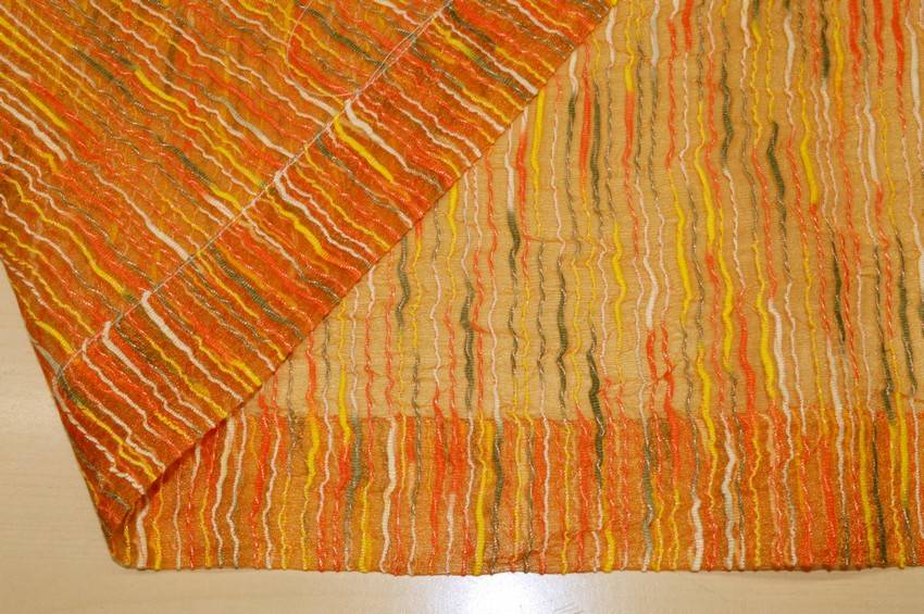 Tessuto per tendini a vetro con laterali gia orlati. Il fondo arancio viene impreziosito da sottili striature irregolari di diverse colorazioni per un effetto multicolor vivace ed originale.