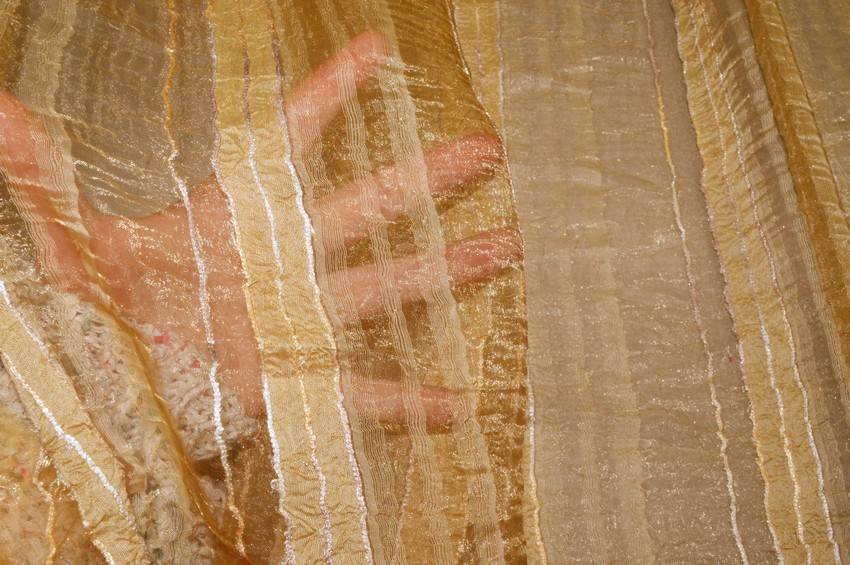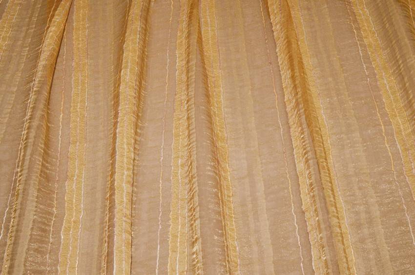Tessuto per tende in organza dorata semitrasparente di mano leggera, cadente e filtrante alla luce. Il fondo viene inoltre decorato da linee irregolari di diversa larghezza donando movimento alla stoffa. Idoneo per realizzare tutti i tipi di tende arricciate.