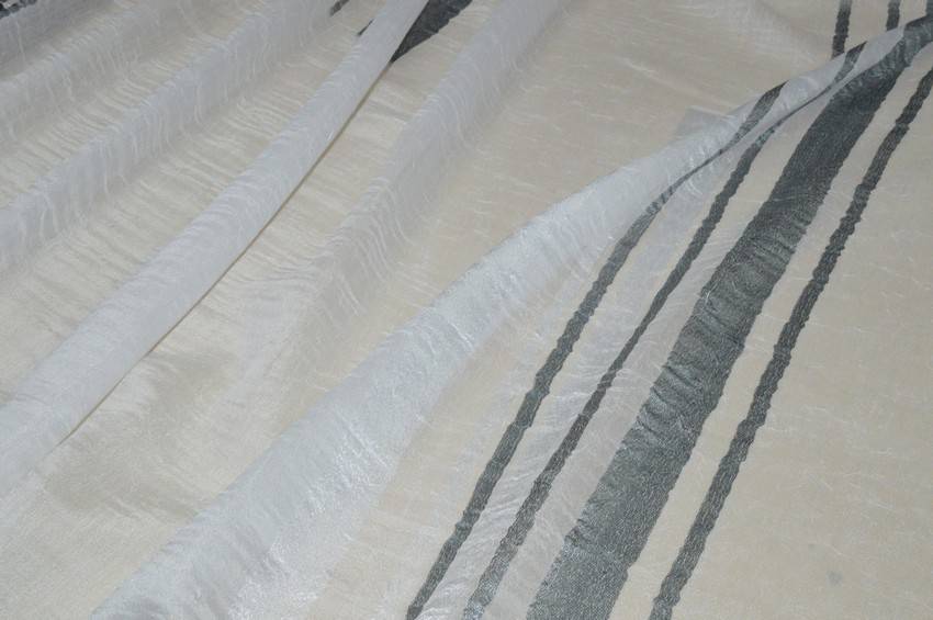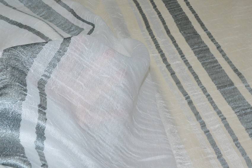 Tessuto di fondo bianco cadente, leggero e semicoprente. La base viene abbellita dai dettagli geometrici di diverse gradazioni di grigio per un aspetto minimale e moderno. Ideale per realizzare tende arricciate.