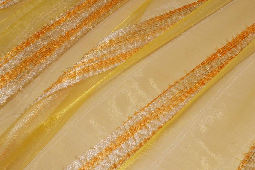 Tessuto in organza molto cadente e filtrante alla luce, perfetto per illuminare il proprio ambiente. Il fondo giallo/arancio viene impreziosito dalle fasce in tono con effetto ciniglia. Simpatico e giocoso è ideale per realizzare originali tende arricciate di ogni tipo.