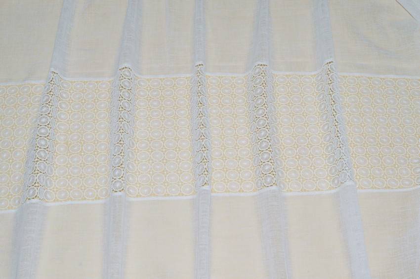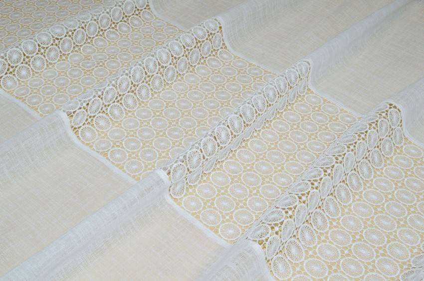 La stoffa viene impreziosita dallo splendido incasso in pizzo macramé che permette alla luce di filtrare illuminando ed ampliando l'ambiente da arredare.  Sul fondo vi è inoltre una doppia balza che dona un aspetto raffinato e classico.