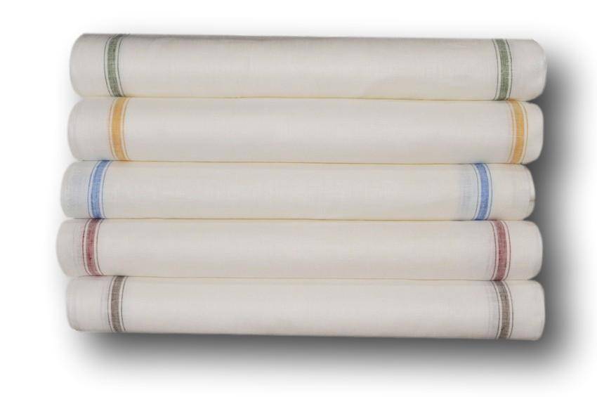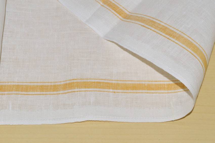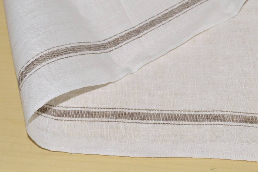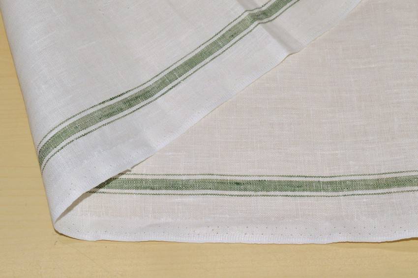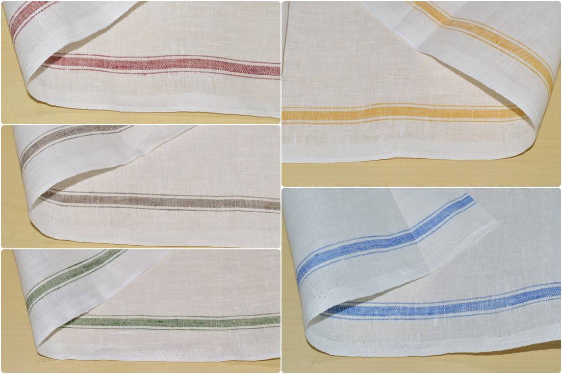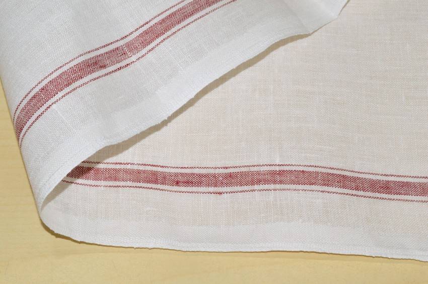 Ottimo tessuto in puro lino per strofinacci con fondo bianco decorato da piccole linee laterali colorate.