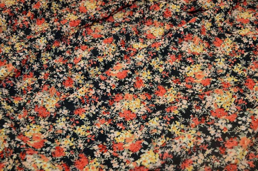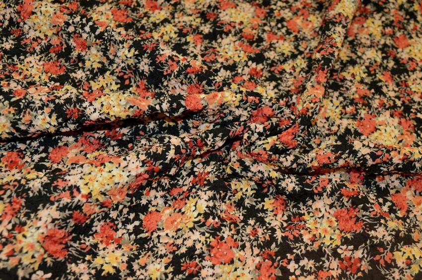 Tessuto di mano leggera abbellito dal fondo goffrato che conferisce alla stoffa un effetto lievemente tridimensionale. La base nera viene inoltre vivacizzata dalla graziosa e colorata fantasia floreale rosa e gialla. Può essere utilizzato per realizzare splendidi capi d'abbigliamento vario come camicette, top e vestitini primavera/estate.