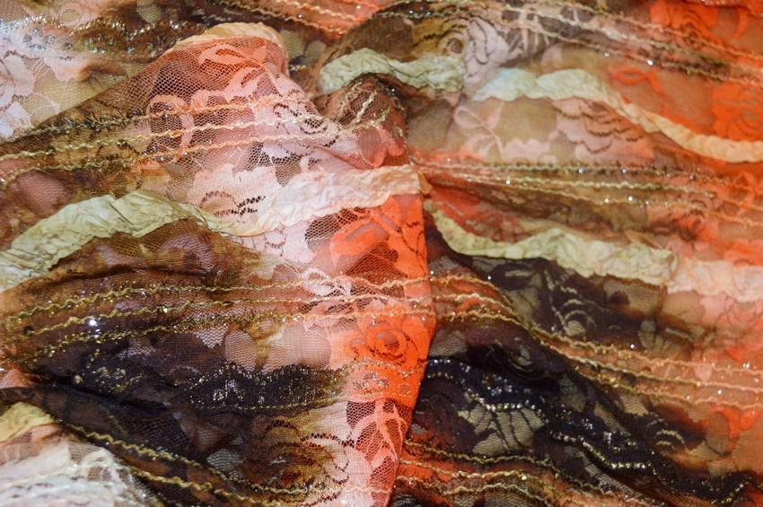 Tessuto con base in pizzo dall'aspetto semicoprente e luminoso grazie ai sottili fili lurex in trama. Il fondo ricamato viene impreziosito su tutta la lunghezza da graziose balze distanti 9 cm l'una dall'altra. Vi sono inoltre sfumature dal marrone all'arancio che donano originalità e carattere alla stoffa rendendola un pezzo unico. Grazie alla sua pesantezza medio-leggera si presta in modo ottimale alla realizzazione di top, abitini ed abbigliamento vario.