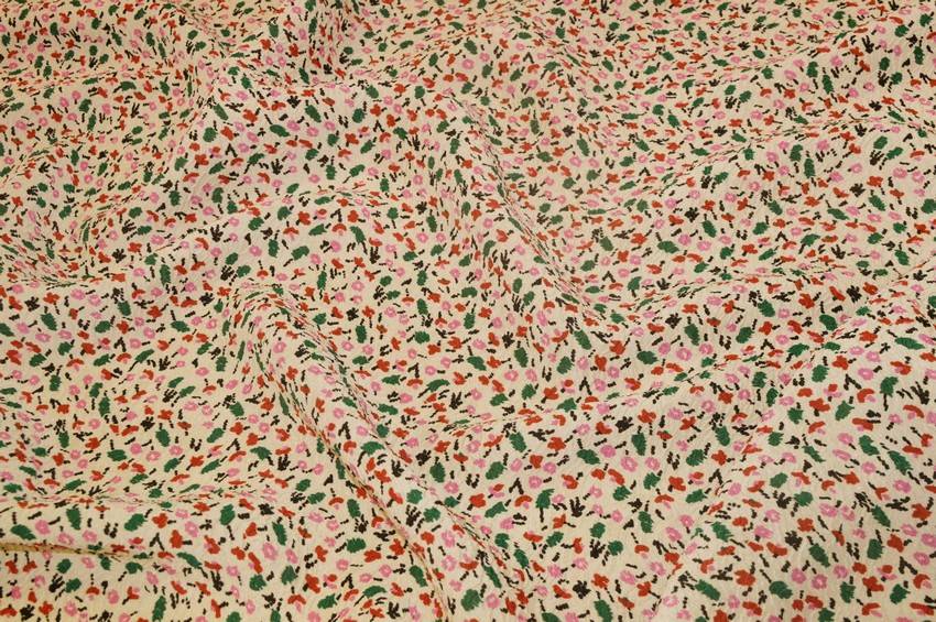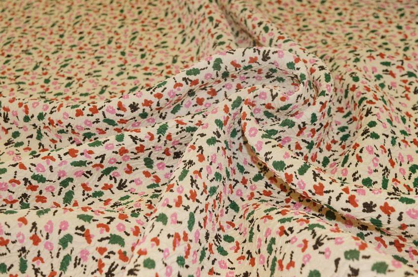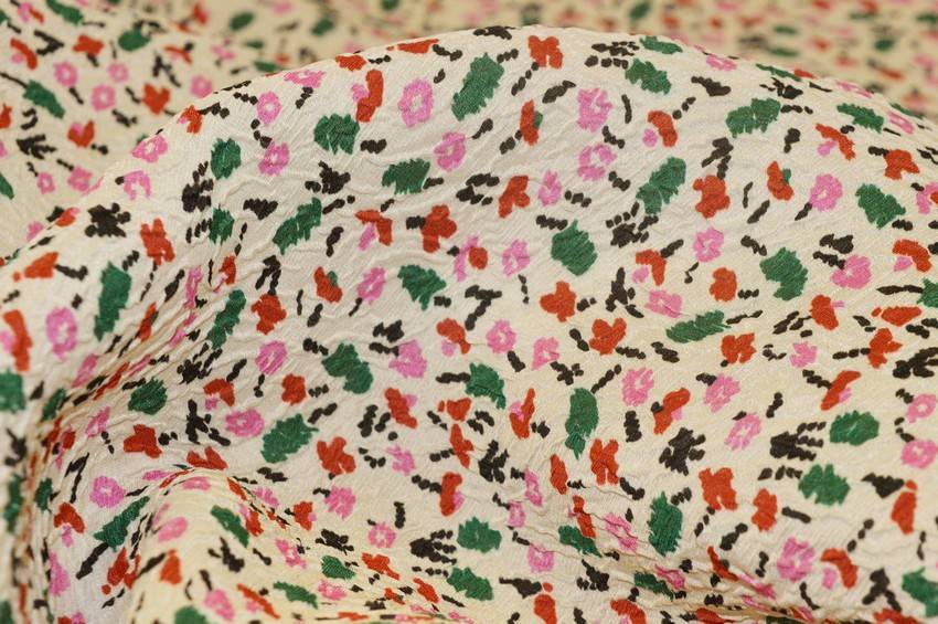 Tessuto in viscosa misto seta color panna abbellito dalla minuta stampa stilizzata rosa e verde con effetto stropicciato. Al tatto risulta molto fresca e leggera, perfetta per top, abiti ed abbigliamento vario primavera/estate.
