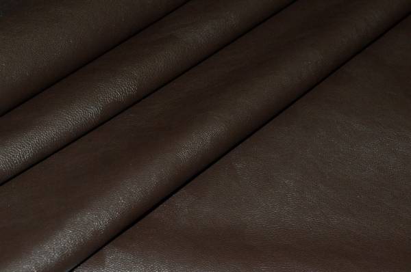 Tessuto di finta pelle marrone leggermente elasticizzata, idonea per realizzare abbigliamento vario come pantaloni, gilet, giacche e gonne.