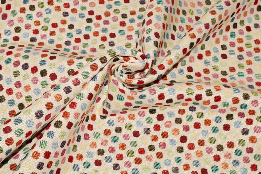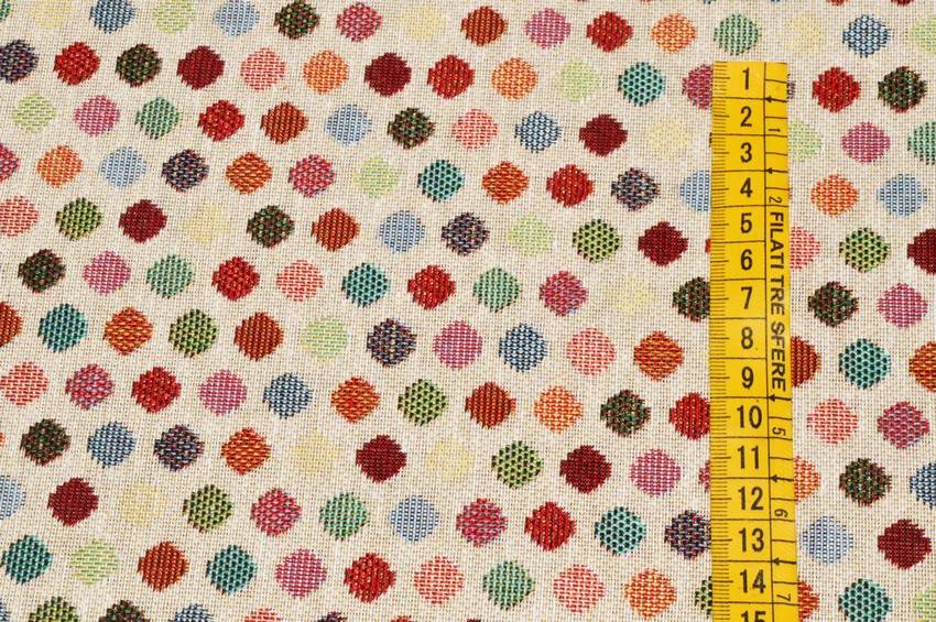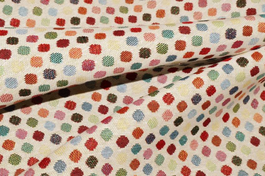 Vivace tessuto per arredo dalla mano resistente e robusta. Dona innovazione e colore agli spazi grazie alla fantasia a pois multicolor. Puo essere utilizzato per realizzare meravigliosi gobelin e runner, accessori per la casa, cuscini, borse e decorazioni per la tavola.