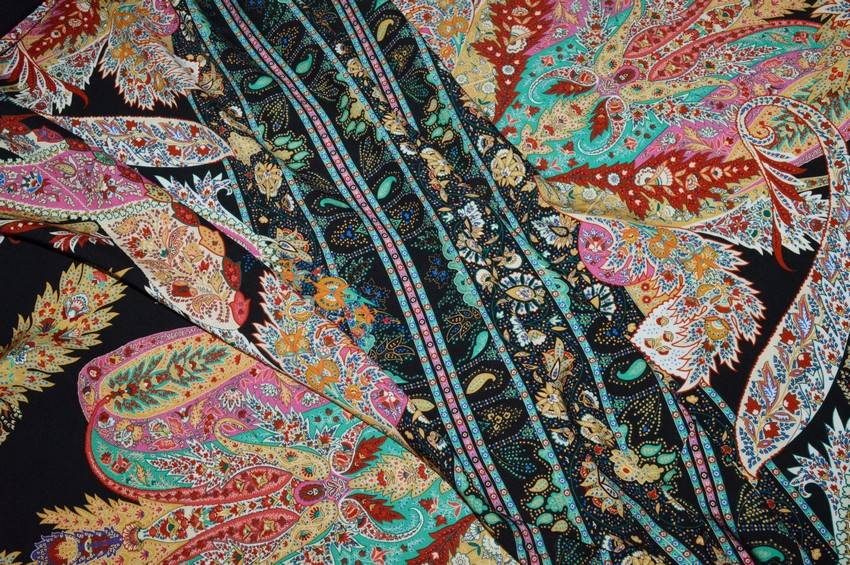 Bellissimo tessuto in pura viscosa che dona freschezza sulla pelle grazie alla sua ottima mano morbida e cadente. Presenta inoltre un aspetto liscio e coprente. Il fondo nero viene vivacizzato dalla sgargiante fantasia che unisce diversi colori per un aspetto unico ed originale. Vi è in aggiunta una banda centrale di 25 cm. Utilizzato comodamente per confezionare capi per le stagioni primavera/estate come abiti lunghi, salariane, gonne e camicette.