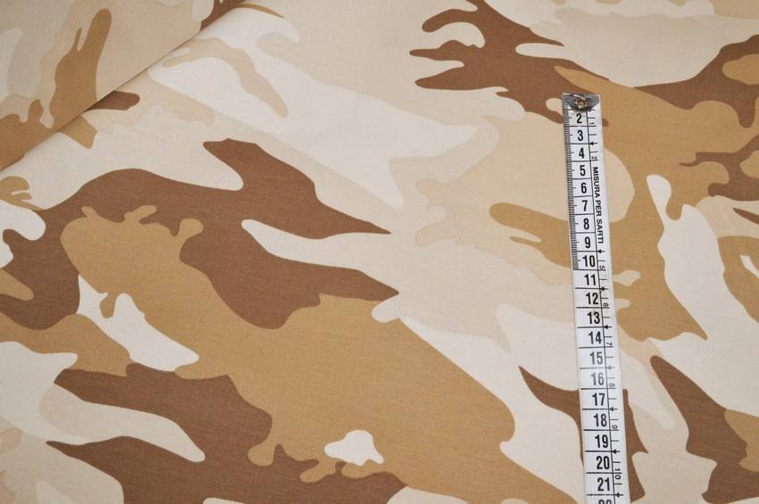 Tessuto gabardine in cotone molto gradevole sulla pelle grazie alla sua freschezza unita ad un aspetto opaco e coprente. Il fondo presenta una delicata colorazione sabbia decorata dal disegno mimetico composto da tonalità più scure. Grazie al suo peso medio è ideale per realizzare capi d'abbigliamento primavera/estate come pantaloni, gonne, magliette ed abitini.