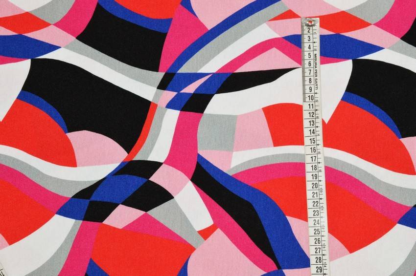Tessuto in maglina di pura viscosa dalla mano elasticizzata, scivolosa, morbida e cadente unita ad un aspetto coprente. Il fondo viene vivacizzato dalla bellissima fantasia astratta composta dagli sgargianti colori come il rosa, il rosso ed il blu regalando unicità e carattere alla stoffa. Utilizzato comodamente per realizzare capi d'abbigliamento pratici come t-shirt, ma anche per abiti più lavorati e ricercati per le stagioni primavera/estate.