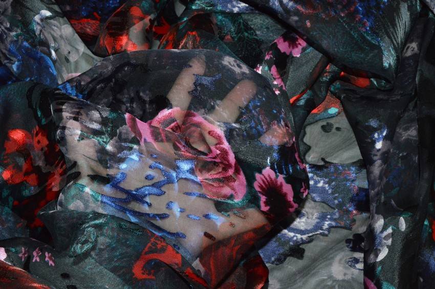 Il fondo semitrasparente nero viene impreziosito dall'elegante fantasia fiorata la quale dona carattere e movimento alla stoffa. Vi sono inoltre dei piccoli dettagli coprenti dall'aspetto luminoso, tipici dei tessuti devoreh.