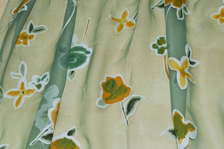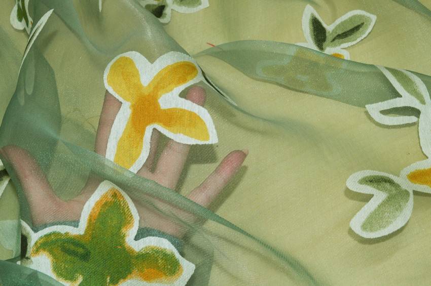 Splendido tessuto con leggero fondo in organza dall'aspetto cadente e molto trasparente. La base viene particolarizzata dalla delicata colorazione verde salvia unita a dettagli coprenti floreali di differenti forme e gradazioni di giallo ed arancio. Ideale per realizzare tende doppie e/o arricciate di ogni tipologia.
