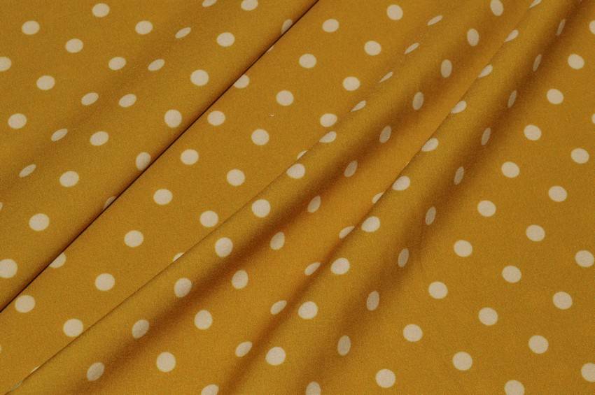 Ottimo tessuto dalla mano crepe, elasticizzata e fresca unita ad un aspetto leggero, cadente, ma coprente. Il fondo presenta una vivace colorazione senape impreziosita dai piccoli bolli panna di 0.5 cm di diametro ciascuno. Utilizzato comodamente per realizzare graziosi vestitini, gonne, camicie e capi d'abbigliamento estivi di vario genere.