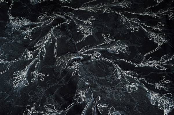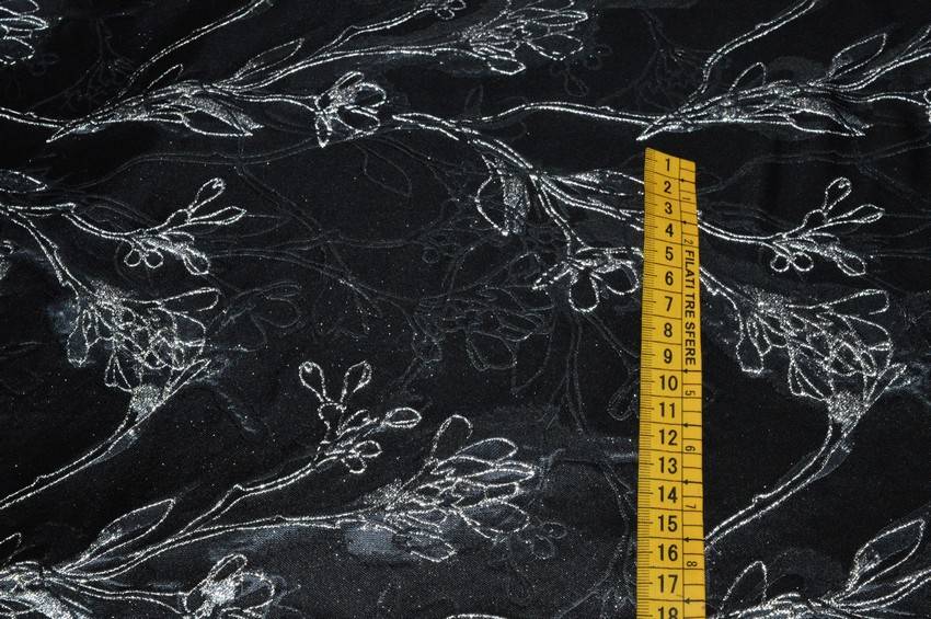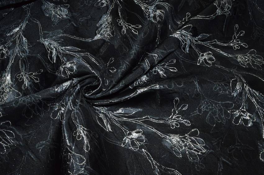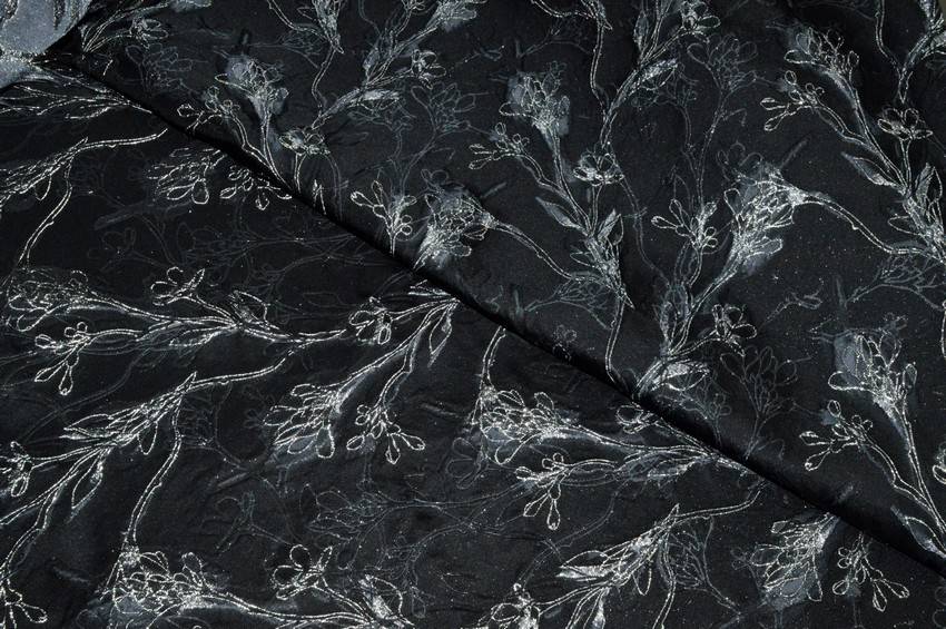 Splendido tessuto di struttura sostenuta unita ad un fondo coprente e luminoso. La base nera viene impreziosita dall'elegante fantasia fiorata la quale unisce differenti forme floreali. A completare il disegno vi sono minuziosi e delicati motivi naturalistici grigi ed in lurex argentati che donano brillantezza e raffinatezza alla stoffa. Di peso ottimale per la realizzazione di giacche, bolerini ed altre tipologie di capi d'abbigliamento elegante.