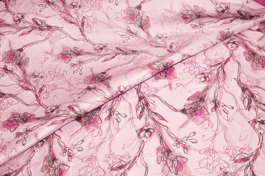 Splendido tessuto di struttura sostenuta unita ad un fondo coprente e luminoso. La base rosa viene impreziosita dall'elegante fantasia fiorata la quale unisce differenti forme floreali. A completare il disegno vi sono minuziosi e delicati motivi naturalistici in lurex argentati con base nera che donano brillantezza e raffinatezza alla stoffa. Di peso ottimale per la realizzazione di giacche, bolerini ed altre tipologie di capi d'abbigliamento elegante.