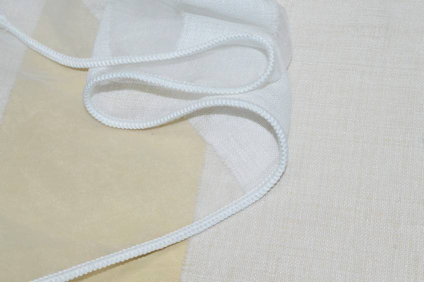 Elegante tessuto di fondo bianco naturale composto da fasce da 6 cm e 20 cm di diversa coprenza le quali donano alla stoffa movimento. Si presenta inoltre cadente, leggera e filtrante alla luce grazie agli inserti in organza. La base viene inoltre decorata da una raffinata fettuccia cucita in modo tale da costruire un'elegante disegno lungo tutta l'altezza della stoffa. Ideale per realizzare ogni modello di tende arricciate.