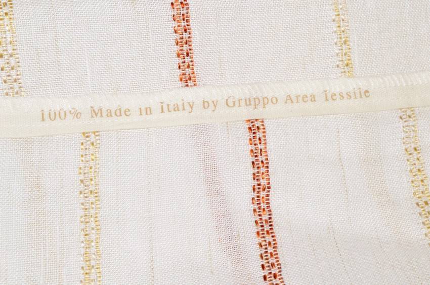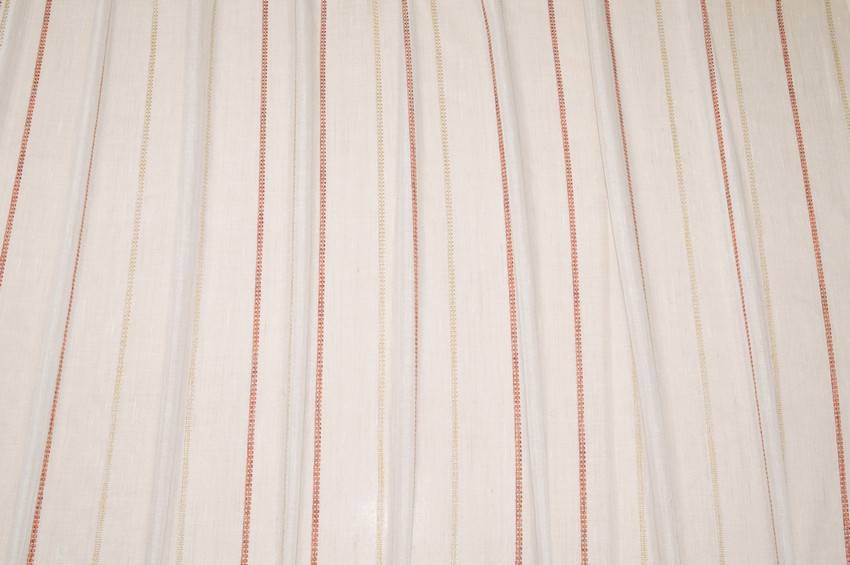 Tessuto per tende in misto lino realizzato interamente in Italia con fondo bianco naturale decorato da sottili e delicate fiammature beige. Vi sono inoltre piccole fasce arancioni e beige che compongono la graziosa fantasia rigata. Presenta un aspetto leggero, cadente e filtrante alla luce, perfetto per arredare i propri spazi realizzando tende arricciate di ogni modello.