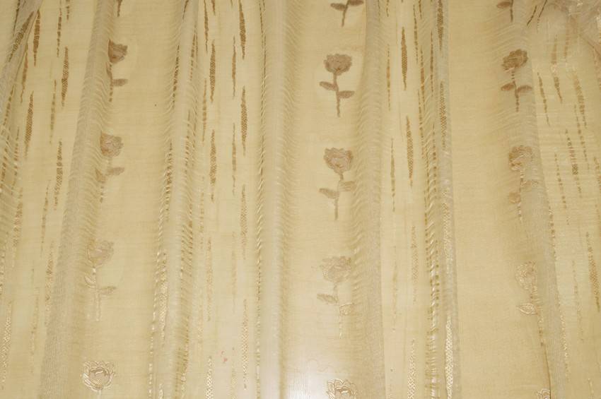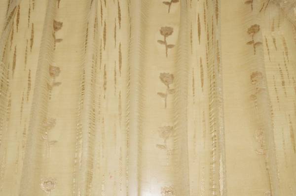 Tessuto con fondo beige in organza dall'aspetto semitrasparente, cadente e leggero, reso luminoso dalle striature e dai motivi floreali lucenti color oro chiaro. Semplice, ma raffinato è ideale per realizzare splendide tende arricciate di ogni tipo.